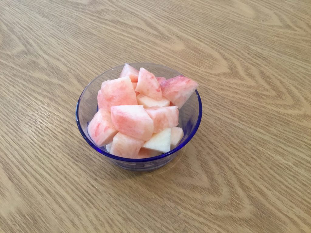 冷凍した後の桃は、不思議なことに解凍した時に手で剥けるようになります。お試しあれ。