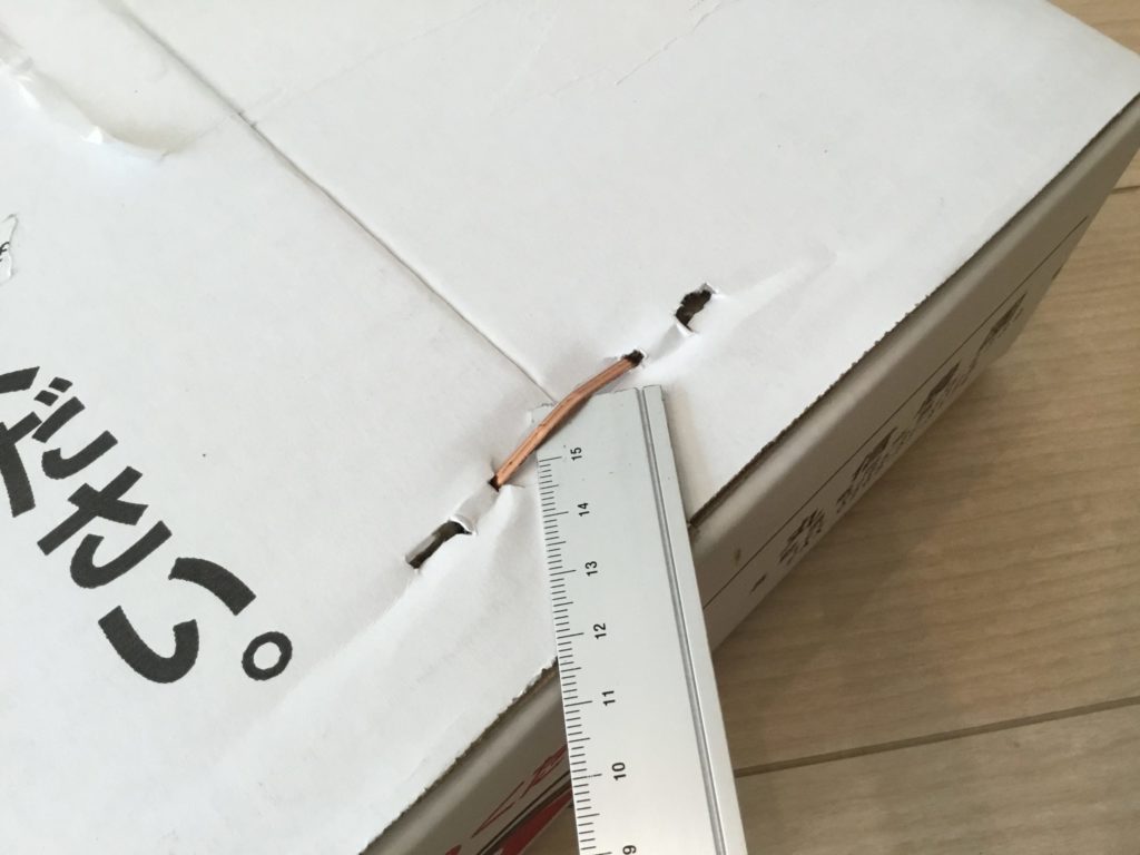 実家から桃が届きました。箱を開けますが、この金具なんとかならないでしょうか。定規が曲がりました。良い開封方法をご存知の方は教えてください。金具も処分に困りますしね。